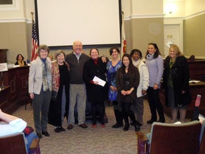 AEF President Bill Sonneman, third from left, presents a check from “All Together Now” to Superintendent Kirsten Vital and several Alameda principals at the January 11, 2011 Board of Education meeting. These funds will support music, art and drama programs in Alameda public schools. Photo courtesy of AEF.