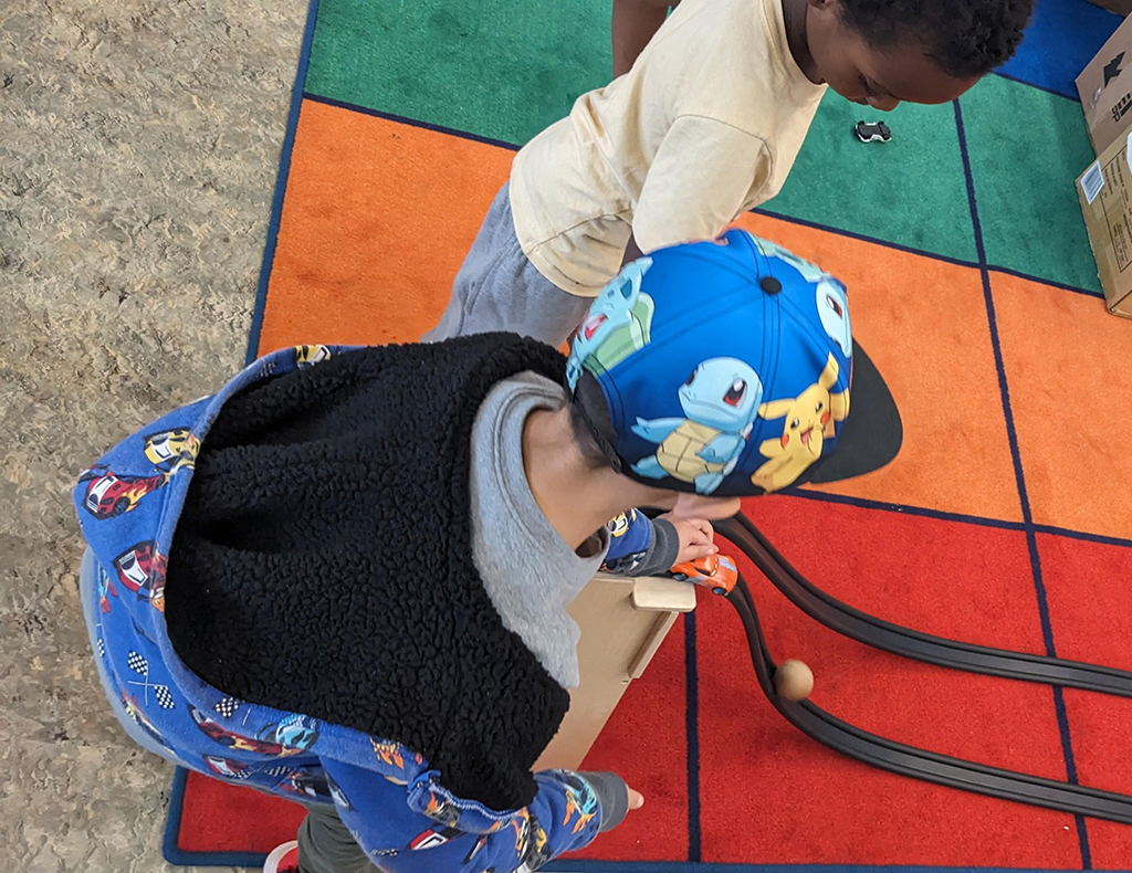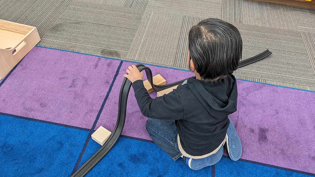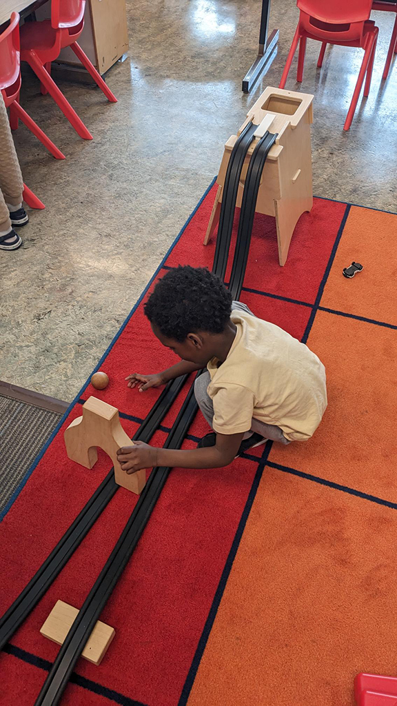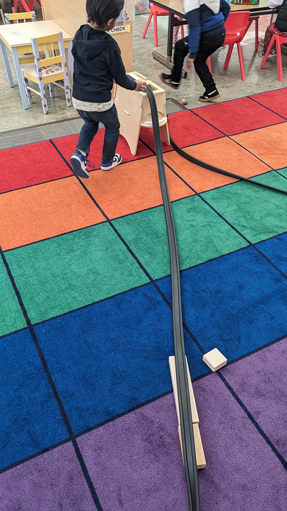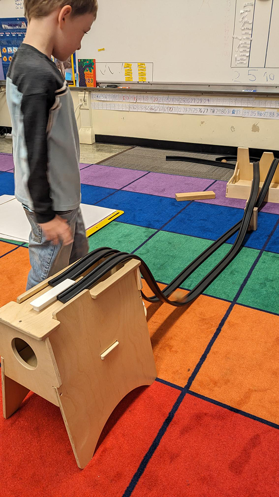 The Rubber Ramp Tower set has allowed my TK students to explore and experiment in so many unique and interesting ways! They have learned how to work together to setup the rubber ramps on the tower. They have explored some of the laws of physics like gravity, speed, and acceleration when the race balls down the rubber ramps. They have also experimented with trying different objects going down the ramps. They figured out that hexagons don’t roll well enough to stay on the track and that balls from other classroom materials (like magnet balls or marbles) roll down wonderfully. They have also experimented with modifying the ramps with wood blocks placed either under or over the ramps. They have figured out that raising the start of the ramp higher makes the balls go faster. They also did some problem solving because the balls would get lost under tables in the classroom after leaving the end of the ramps. This led the students to conclude that they needed to have the ends of the ramps go into a plastic bin to collect them once they complete the track.
